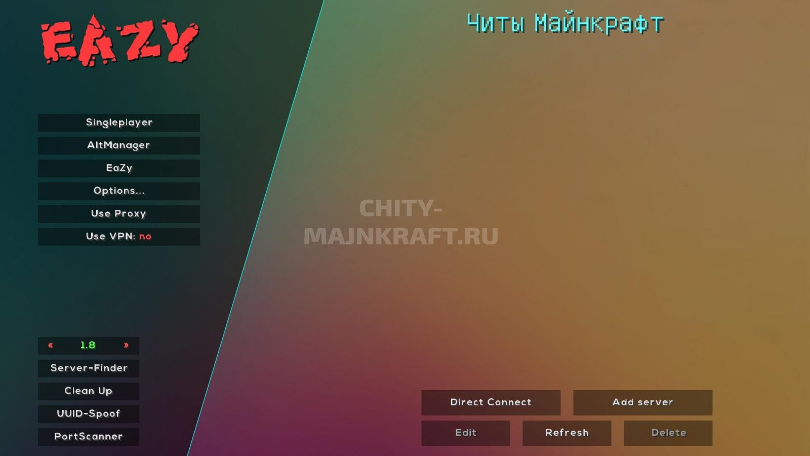 La conception de la Triche est magnifiquement faite. En entrant Minecraft, vous aurez immédiatement une liste de serveurs à droite, et à gauche se trouvent diverses fonctions utiles dont nous parlerons un peu plus tard.